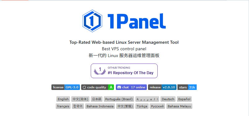 首先,我们需要一个方便我们部署服务器项目的面板,考虑到大部分小伙伴都是小白,一个服务器指令图形界面就很重要了,木鱼这里强烈推荐小伙伴在买了自己的服务器后第一时间安装1Panel面板,这是一个开源免费的面板(有付费功能,但一般不会需要),在Github上有31k的收藏量,GitHub地址是