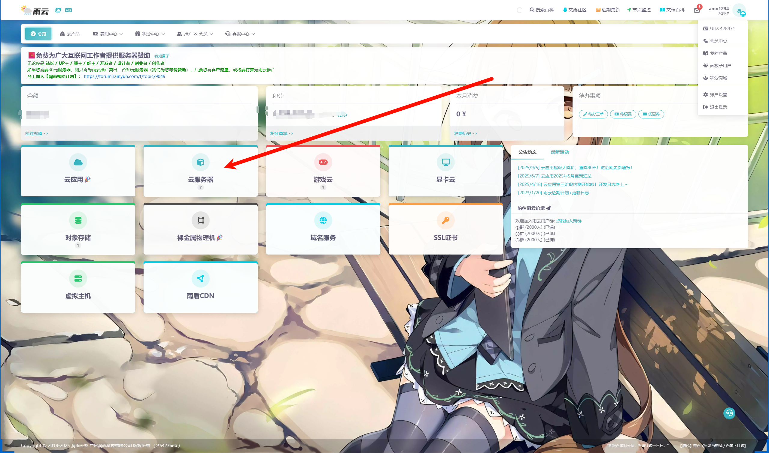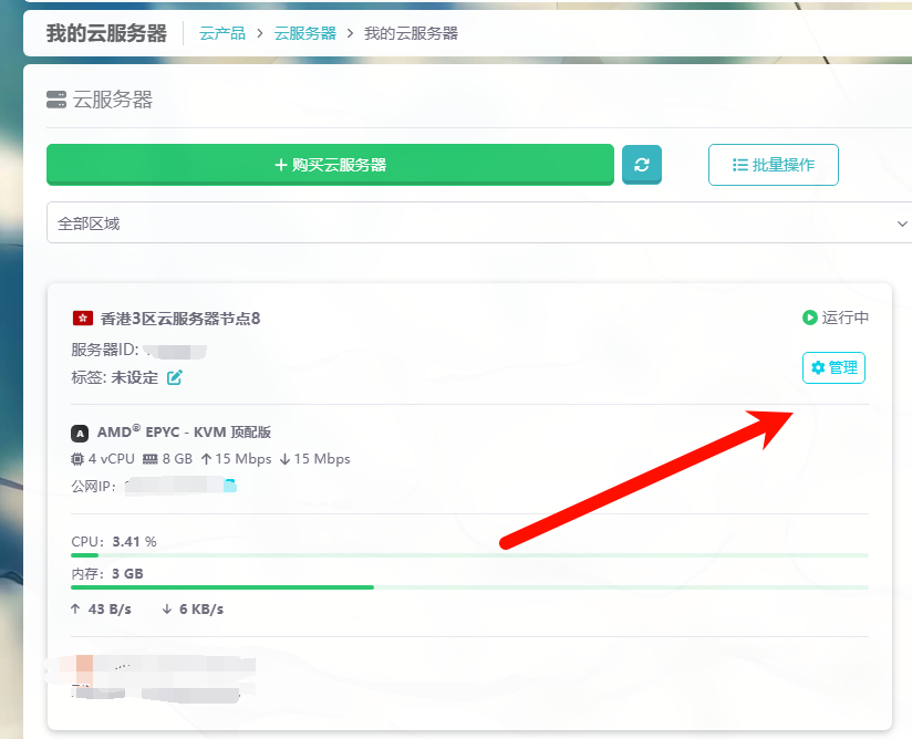 第一步,打开雨云服务器主页(https://app.rainyun.com),登录账号后点开左上角的总览,再点开云服务器,就能看到小伙伴自己购买的云服务器列表
