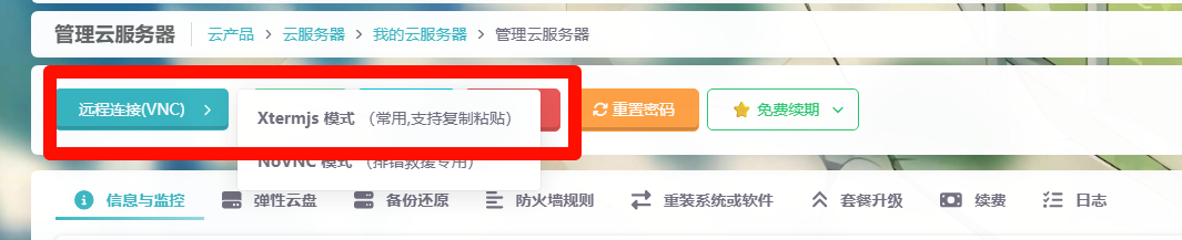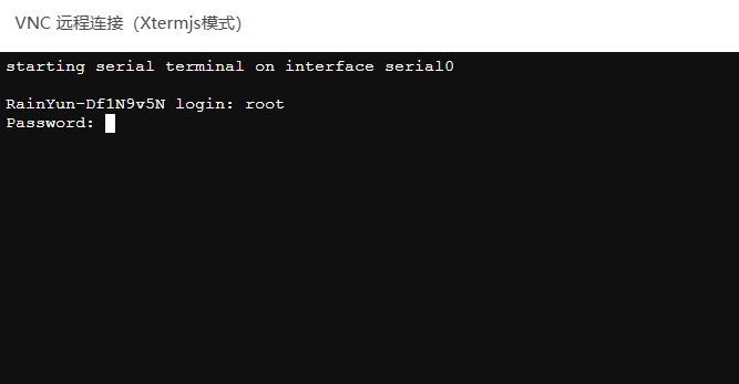 点开左上角的远程连接(VNC)面板,选择Xtermjs模式,在命令面板中按下enter键,先输入账户名root,按下enter,再粘贴复制到远程密码(黏贴一次后面板是不会显示你所粘贴的密码,粘贴一次就可,然后按enter键)