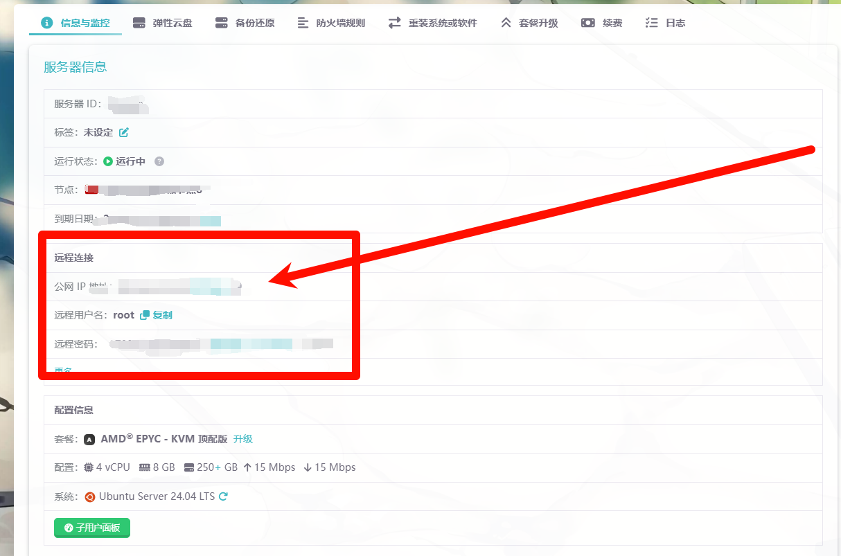 先复制我们服务器的账号名和远程访问密码,默认账号名一般不需要改,就用root