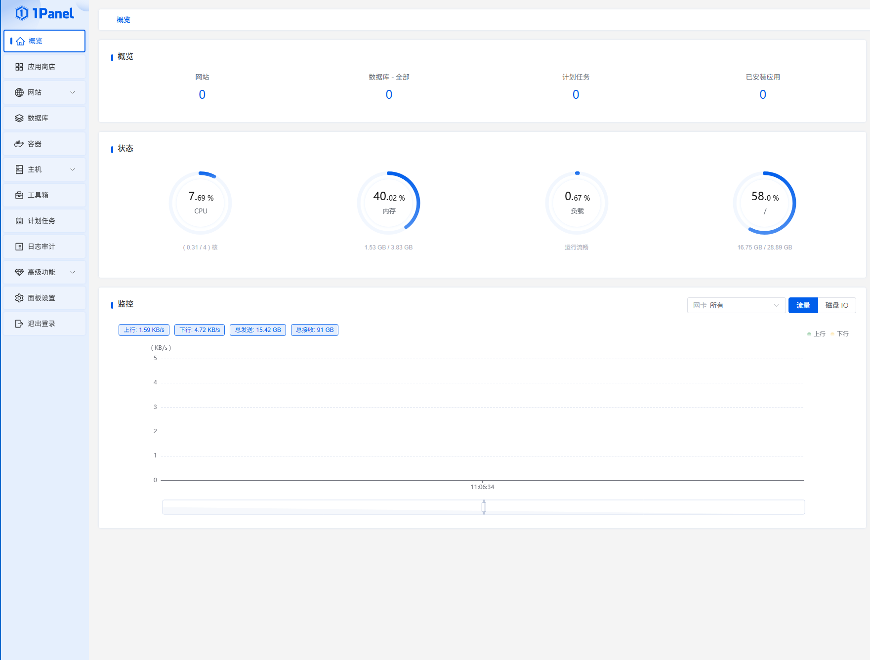 可以看到,你的服务器信息在1Panel上可以清晰掌握,同时你可以直接在应用商店安装1Panel官方推荐的应用开源项目