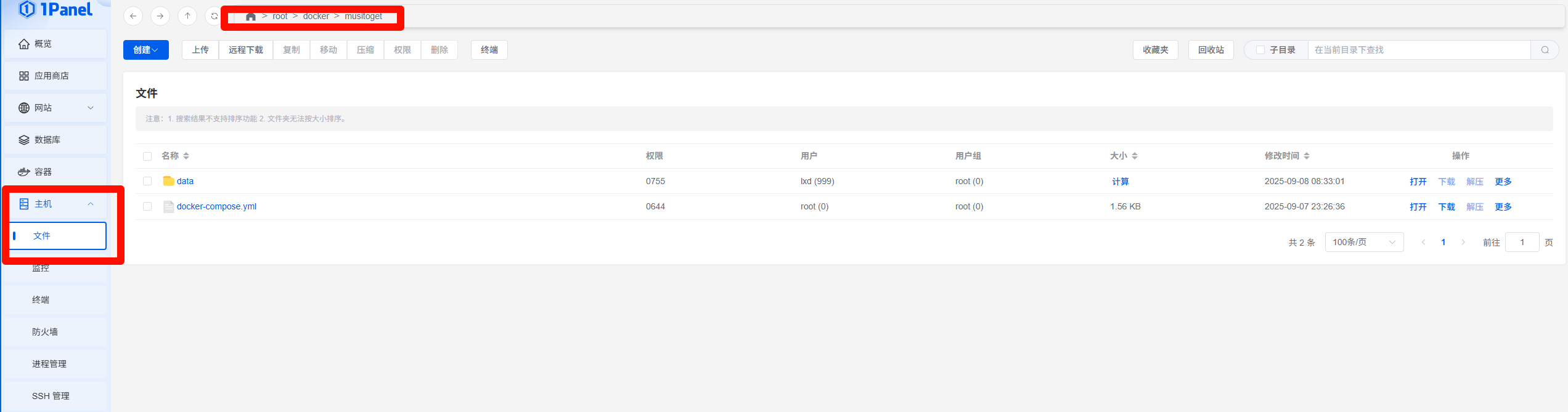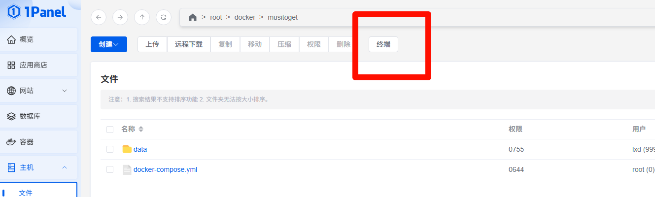 如果你出现的界面下面图片里的内容不是你设置的docker-compose.yml文件所在位置,请点击1Panel左侧文件面板,找到刚才的位置,重新进入终端