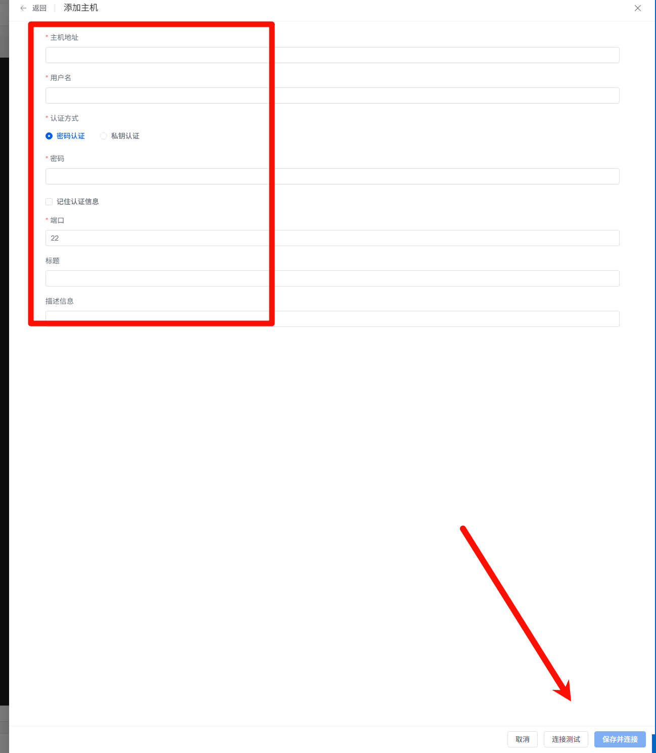 首次进入终端需要填写服务器信息,即刚才雨云服务器云服务器管理面板的用户名和远程密码,记得点击记住认证信息复选框,点击测试连接,测试成功后,点击保存并连接